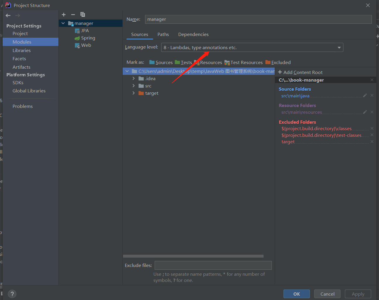 查看 Project Setting 下 Project 和Modules栏目中的Java版本是否一致,如果不一致,改成本地使用的Java版本。
