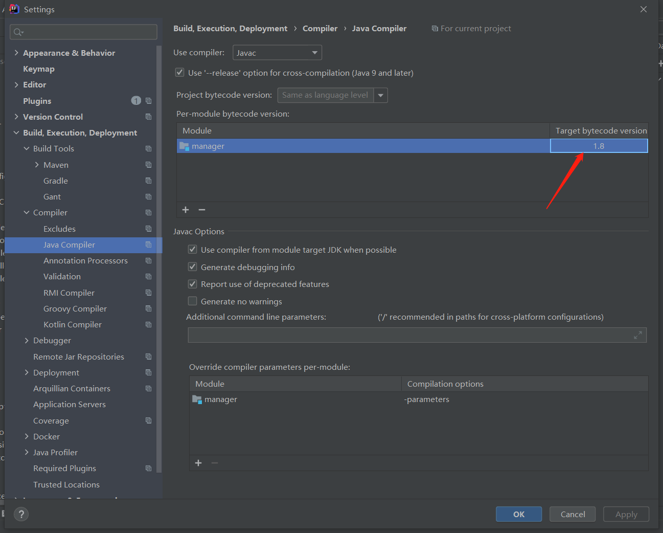 点击“Settings”–>“Bulid, Execution,Deployment”–>“Java Compiler”,Target bytecode version设为本地Java版本。(可以在Default Settings中把Project bytecode version 一劳永逸地配置成本地Java版本)